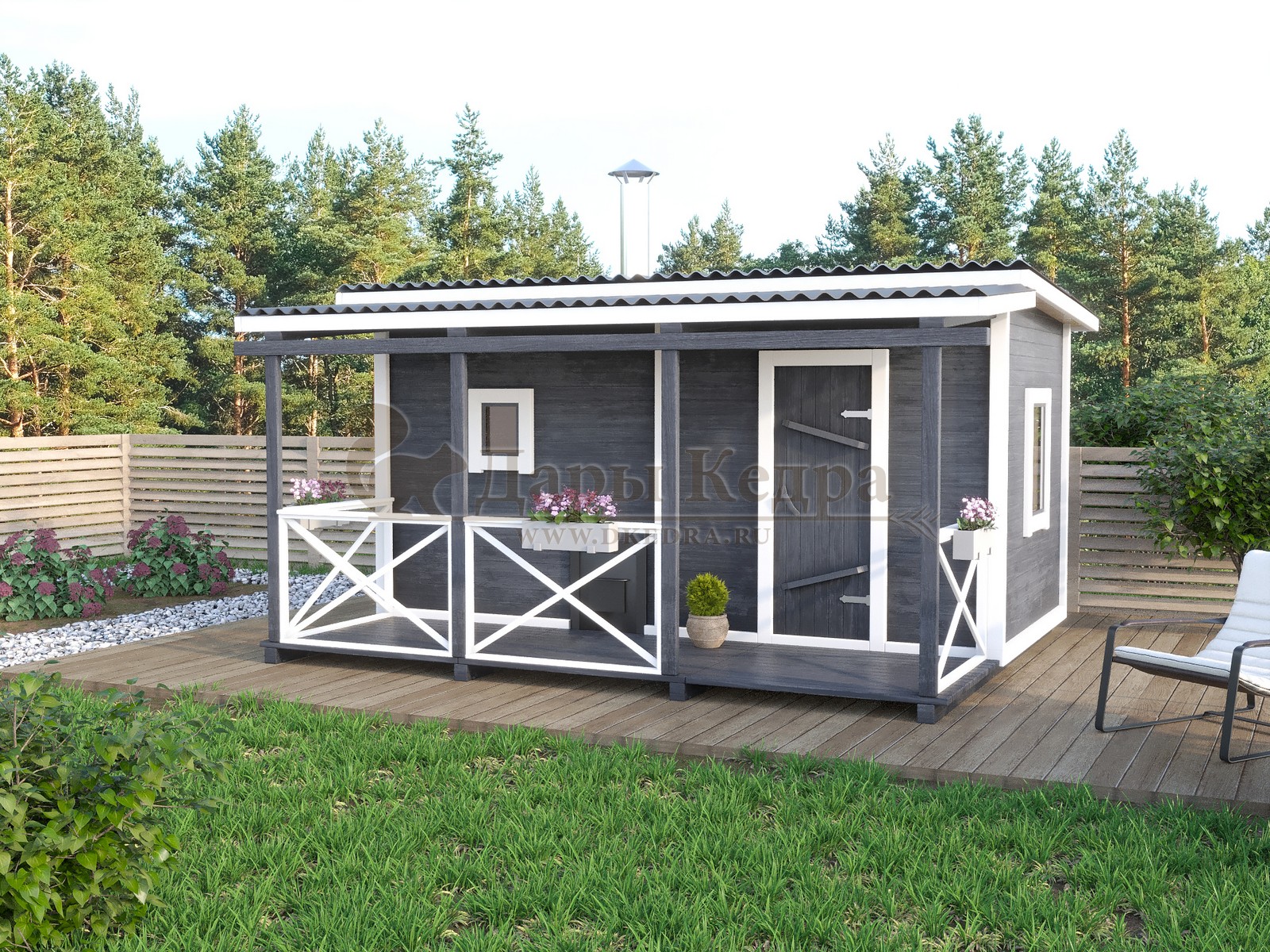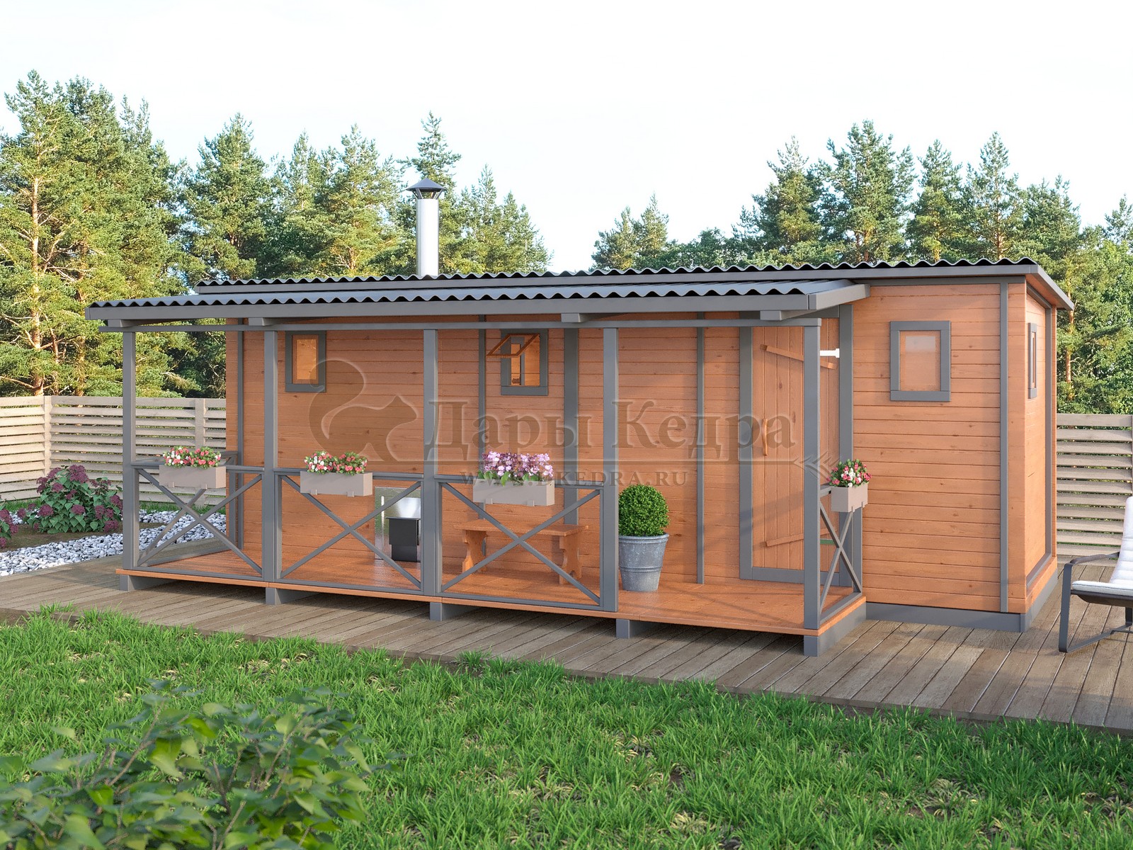 Каркасно-щитовая баня из кедра «Оптима» с верандой Классическая щитовая баня под ключ из кедра 4 на 3 метра, с двумя отделениями, предбанником и парной. Время растопки такой бани не превышает 30 минут. На просторной веранде можно оставить вещи или отдохнуть после парения Баня изготавливается из кедра без отбора по сучкам. Сучки у кедра не смолят и именно они содержат в себе максимальное количество полезных веществ - фитонцидов. Обращаем Ваше внимание, что в карточке товара изображено изделие с дополнительными опциями для ознакомления. Перед оформлением заказа, проконсультируйтесь у менеджера и он предоставит актуальную информацию по стандартной комплектации