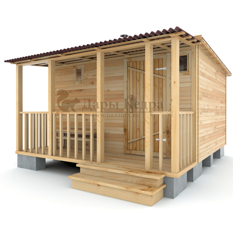 Каркасно-щитовая баня из кедра «Стандарт» с верандой Это классическая прямоугольная модель бани с тремя отделениями: предбанником, моечной и парилкой. Для удобства пользования предбанник оснащен лавочкой и вешалкой. В моечной находится лавка и полочка из кедра. Парилка оборудована двухуровневым открытым полком и печью. За счет небольших размеров баня нагревается не более 30 минут. На просторной веранде можно оставить вещи или отдохнуть после парения. Каркасно-щитовую баню можно заказать как в готовом, так и в разборном варианте. В разборной модели готовые щиты из кедра быстро собираются в полноценное строение, что также позволяет исключить лишний строительный мусор. Такая баня не требует полноценный фундамент, поэтому при необходимости ее можно перенести в другое место. Обращаем Ваше внимание, что в стандартную комплектацию бани входит полок открытого типа в парной. Дополнительно можно заказать полок закрытого типа или лавку! Древесина кедра насыщена эфирными маслами и фитонцидами, которые активируются при воздействии температур. Таким образом, парение в каркаско-щитовых банях из кедра становится еще полезнее.
