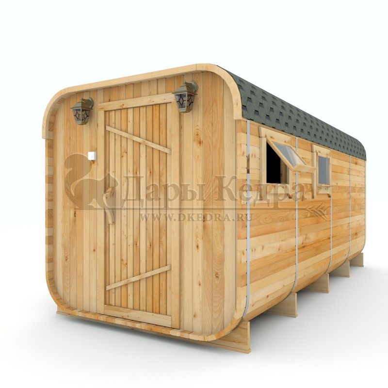 Баня-бочка буханка из кедра с козырьком (все размеры) Баня-буханка более просторная за счет увеличенной высоты потолков и ровного пола. Козырек не только украшает баню, но и защищает оставленную обувь от дождя. Лавочки из кедра находятся по всей длине бани-бочки с обеих сторон. Печь расположена в парилке около дальней стены. Время растопки такой бани не превышает 30 минут. В зависимости от выбранного размера баня-бочка буханка с козырьком имеет следующую комплектацию: Баня-бочка буханка 2,5 метра - парилка; Баня-бочка буханка 3,5 и 4,5 метра - раздевалка, парилка; Баня-бочка буханка 5,5 метров - раздевалка, парилка, моечная. По вашему желанию ее можно укомплектовать печью с внешней загрузкой, благодаря которой весь мусор вовремя топки остается на улице. Баня-бочка буханка не требует полноценный фундамент, поэтому при необходимости ее можно перенести в другое место. Обращаем Ваше внимание, что в стандартную комплектацию бани входят полки открытого типа в парной с обеих сторон. Дополнительно можно заказать полок закрытого типа или лавку! Кедр обладает ароматическими свойствами. Он не деформируется и влагоустойчив, при правильном уходе за деревом на нем не развиваются грибки и плесень.